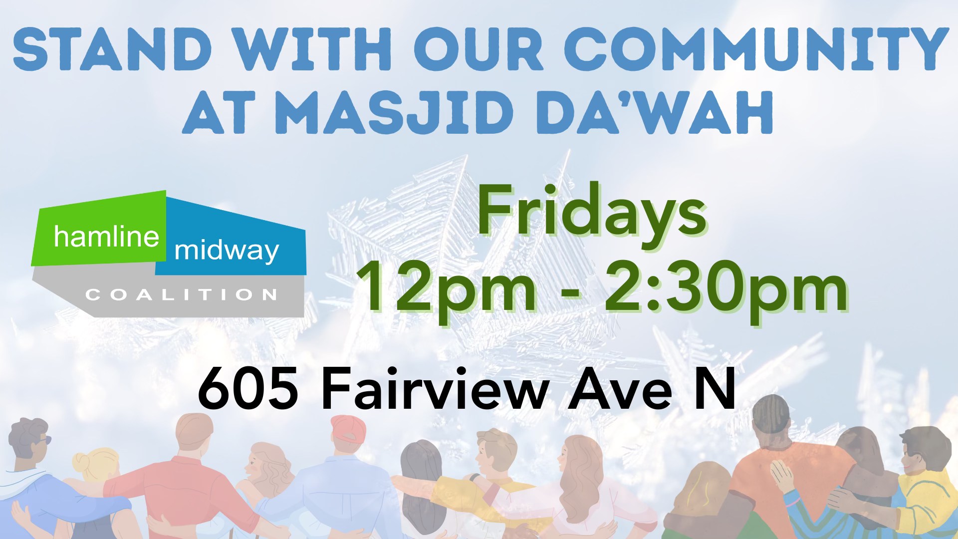 After meeting with leadership from Masjiid Da’wah, we are answering a call for neighbors to continue to show up in solidarity and maintain a strong, visible neighborhood presence outside the mosque each Friday.